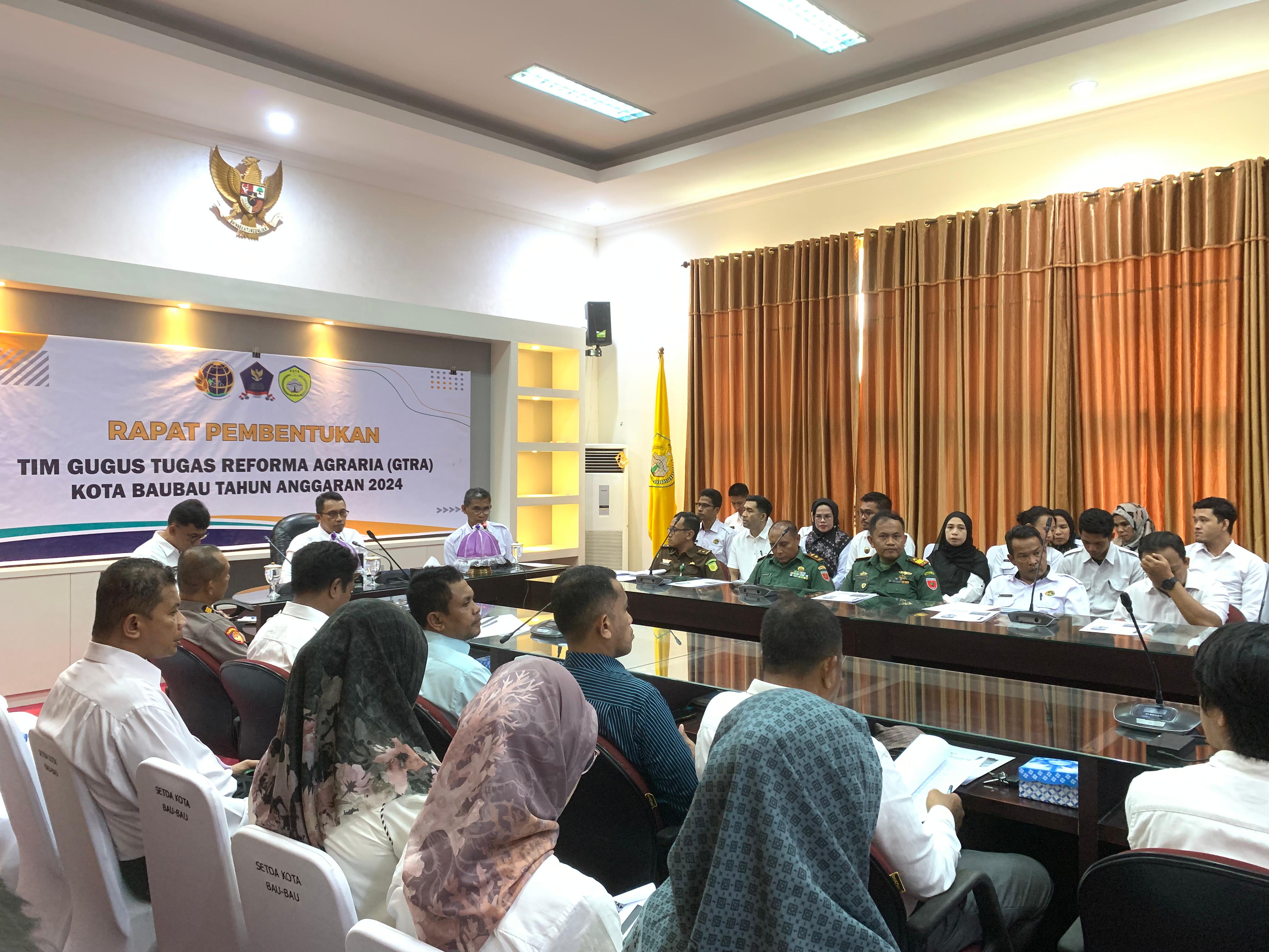 Baubau – Pemerintah Kota Baubau menggelar rapat pembentukan Tim Gugus Tugas Reforma Agraria (GTRA) Tahun Anggaran 2024 pada 31 Oktober 2024 di Ruang Rapat Kantor Wali Kota Baubau. Kegiatan ini dihadiri oleh unsur pemerintah daerah, instansi vertikal, dan akademisi, dengan tujuan membentuk tim yang akan mengawal pelaksanaan program reforma agraria di wilayah Kota Baubau.